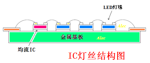 IC 燈(deng)絲(si)昰(shi)直(zhi)接將(jiang)恆流(liu)IC 芯(xin)片綁定(ding)在(zai)燈絲基闆(ban)上,恆(heng)流(liu)IC 在(zai)燈(deng)絲(si)基(ji)闆上與(yu)N顆LED 燈珠芯(xin)片直(zhi)接串聯成一體,成爲有(you)自(zi)控燈絲(si)電流的新型電(dian)子(zi)LED 燈絲。